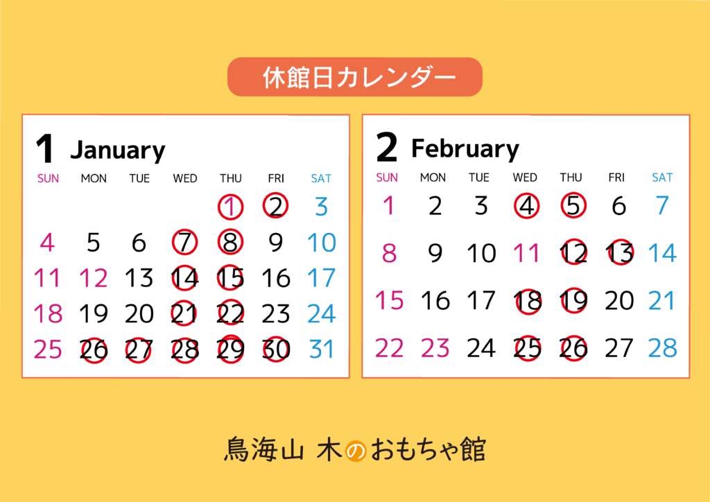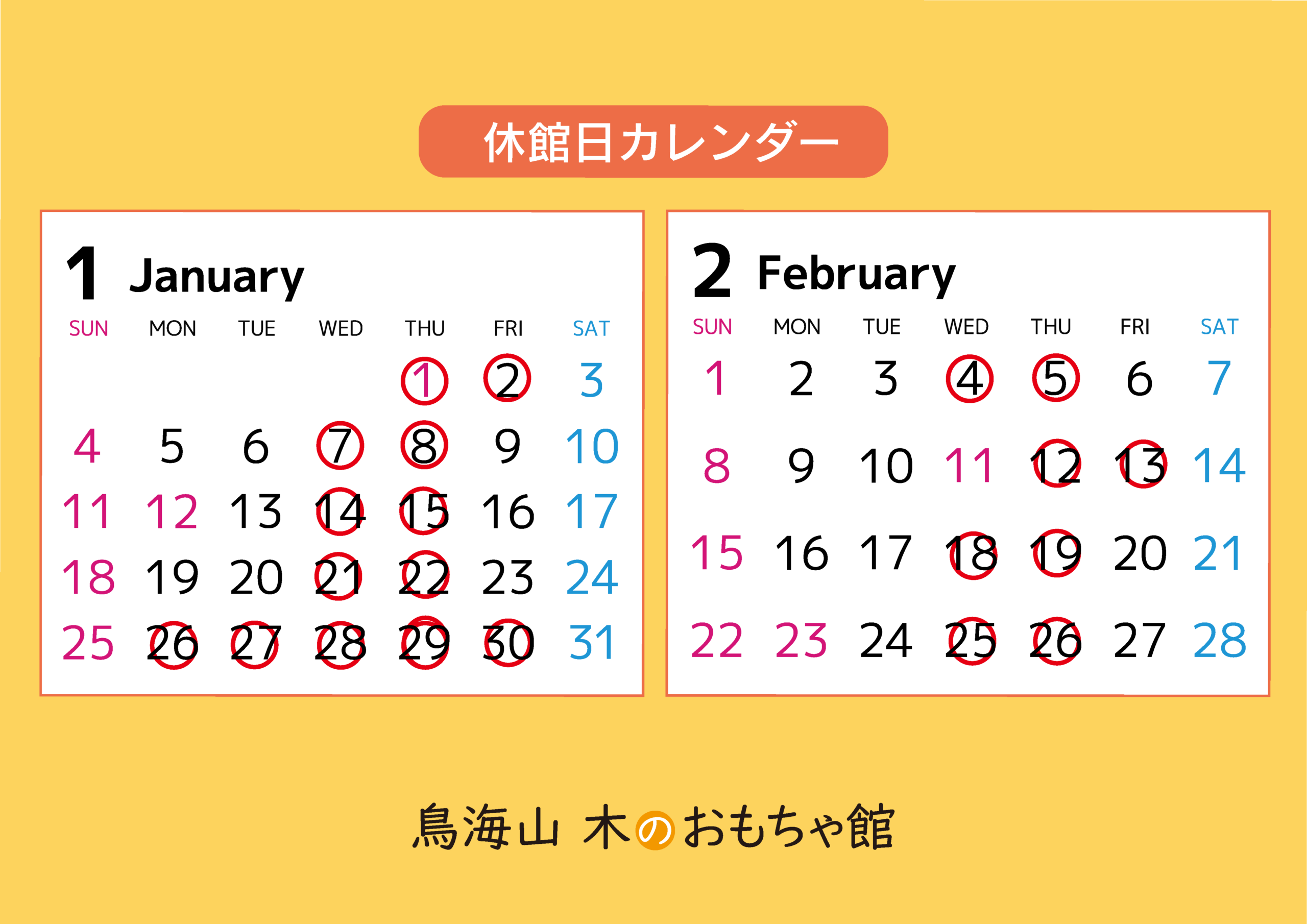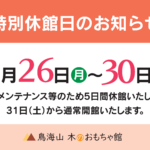 - 特別休館日のお知らせいつも鳥海山木のおもちゃ館にご来館いただき誠にありがとうございます。 1月26日(月)~1月30日(金)は館内メンテナンス等のため休館いたします。 1月31日(土)から通常開館いたします。 寒い日が続きますが、暖かくして […]
