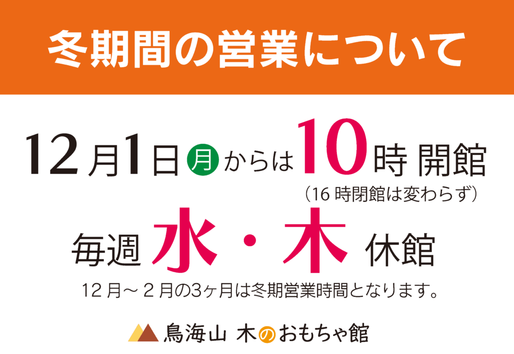 鳥海山 木のおもちゃ館は12月1日(月)から2月28日(土)までの冬期間、毎週 水曜と木曜が休館日となります。また、その期間は開館時間が10時~16時となります。