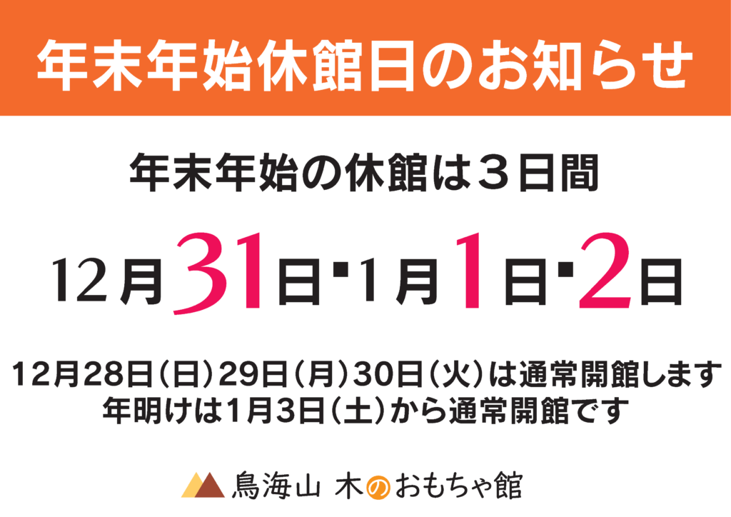 年内は12月30日(火)まで、年始は1月3日(土)から通常開館いたします。