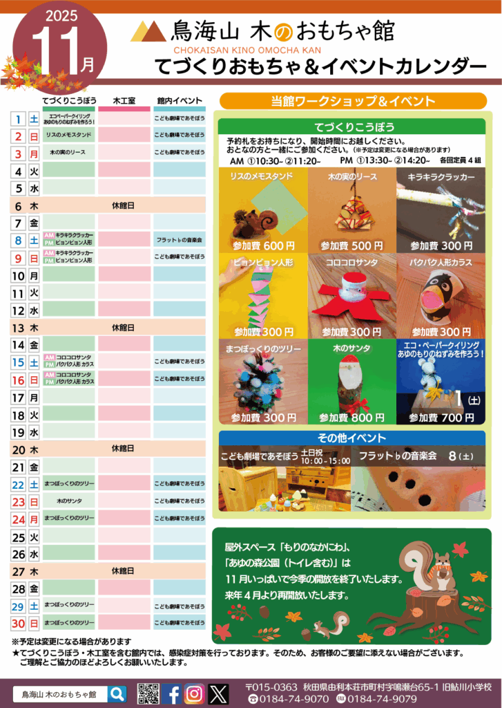 鳥海山 木のおもちゃ館では「てづくりこうぼう」や「木工室」で毎月さまざまな「てづくりおもちゃ」&「ワークショップ」を企画しています。
