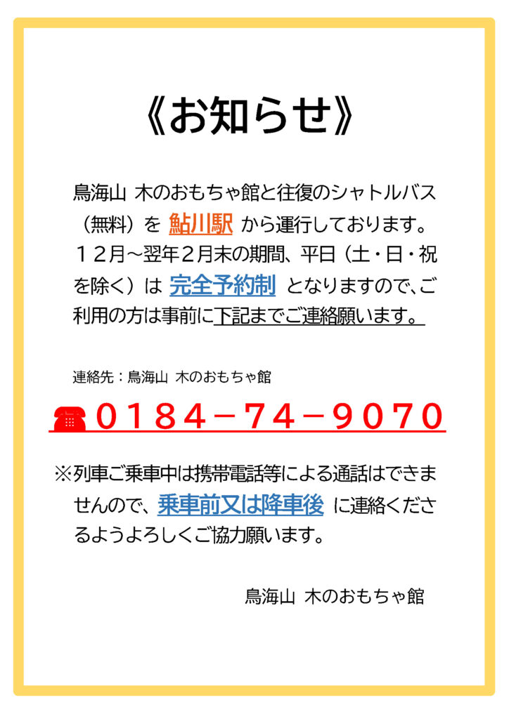 鳥海山 木のおもちゃ館 シャトルバス運行時刻表(2025.3.15現在)