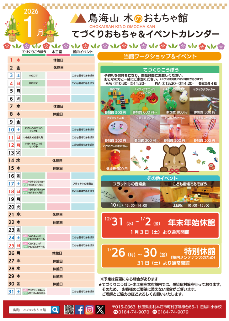 鳥海山 木のおもちゃ館では「てづくりこうぼう」や「木工室」で毎月さまざまな「てづくりおもちゃ」&「ワークショップ」を企画しています。